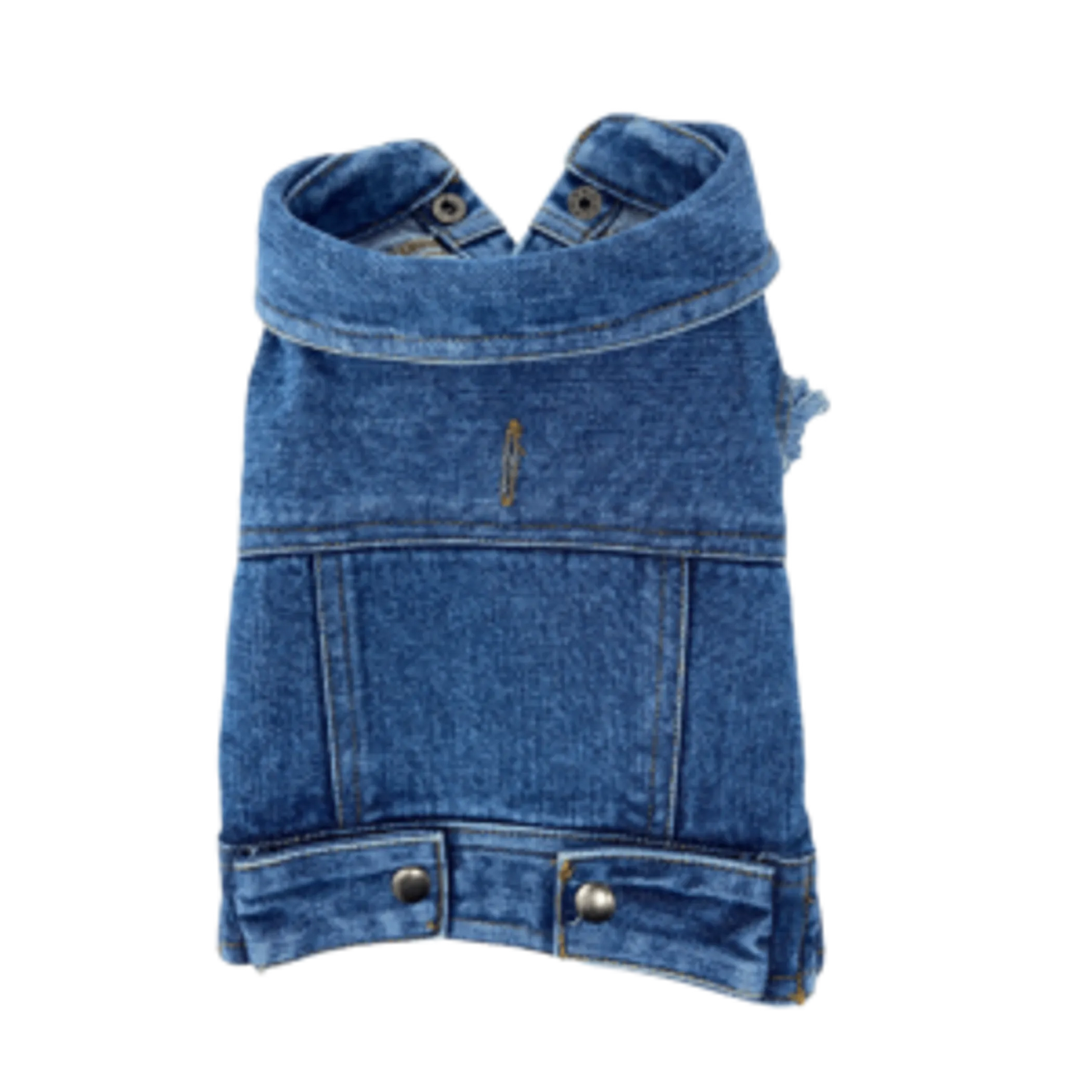 Denim Vest with D/N topstitch on back yoke, seams & armhole. Your pup will strut with attitude with added features of back tabs, gunmetal hardware, frayed armholes & an authentic denim wash,