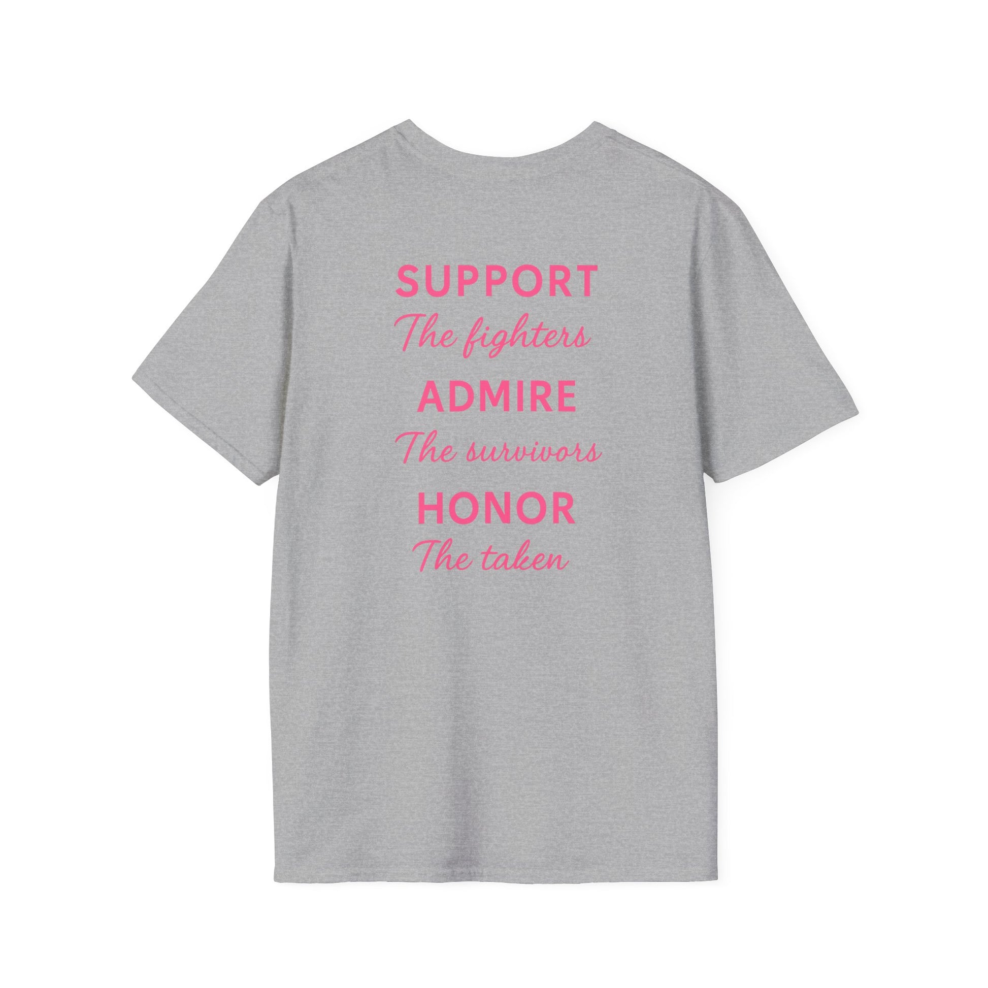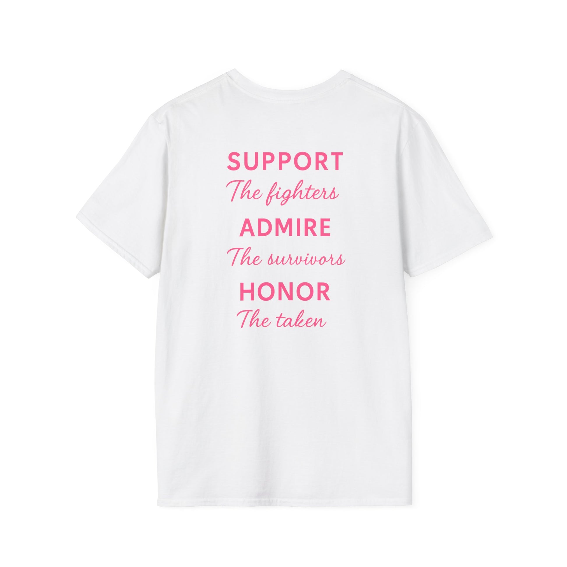 Introducing our Unisex Softstyle T-Shirt, a versatile addition to your wardrobe that embodies support, admiration, and honor for those affected by breast cancer. With its soft, lightweight fabric, this t-shirt feels like a hug, perfect for wearing year-round. The uplifting messages on the back inspire a sense of community, making it an ideal choice for individuals who want to make a statement and show solidarity during awareness months. This shirt is perfect for supporters, family members, and friends participating in events like Breast Cancer Awareness Month, walks, or fundraisers. Wear it to casual outings, family gatherings, or community events, and celebrate strength and resilience together!