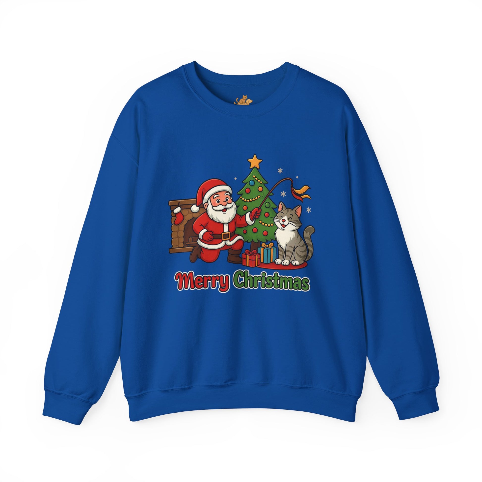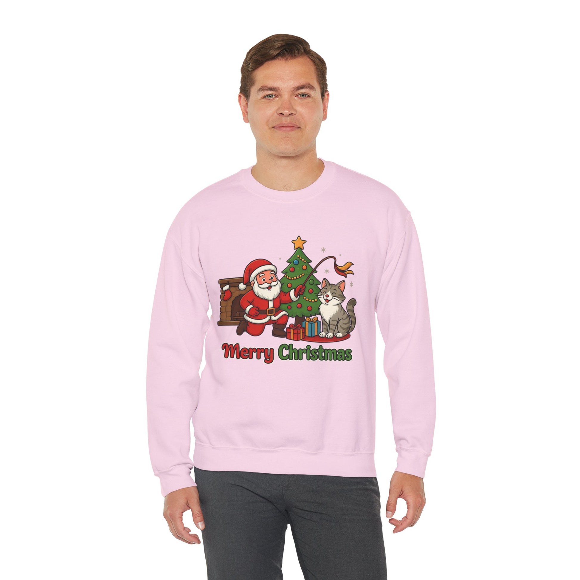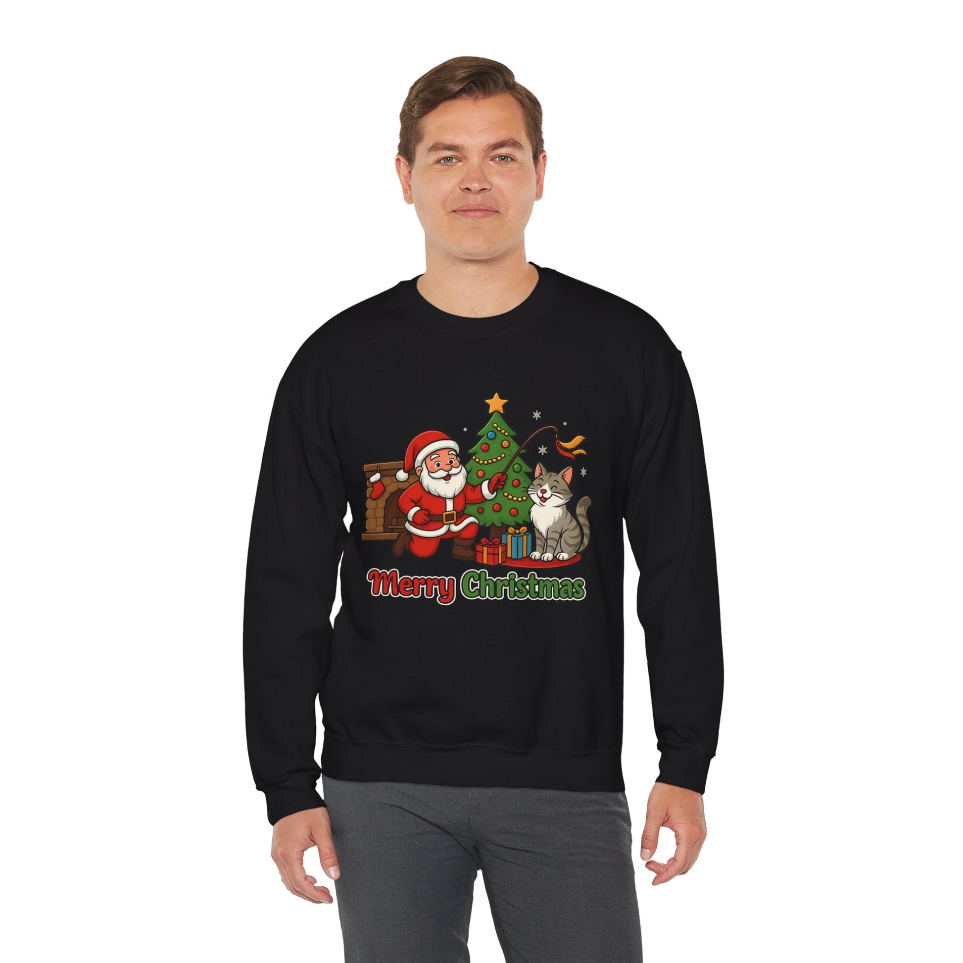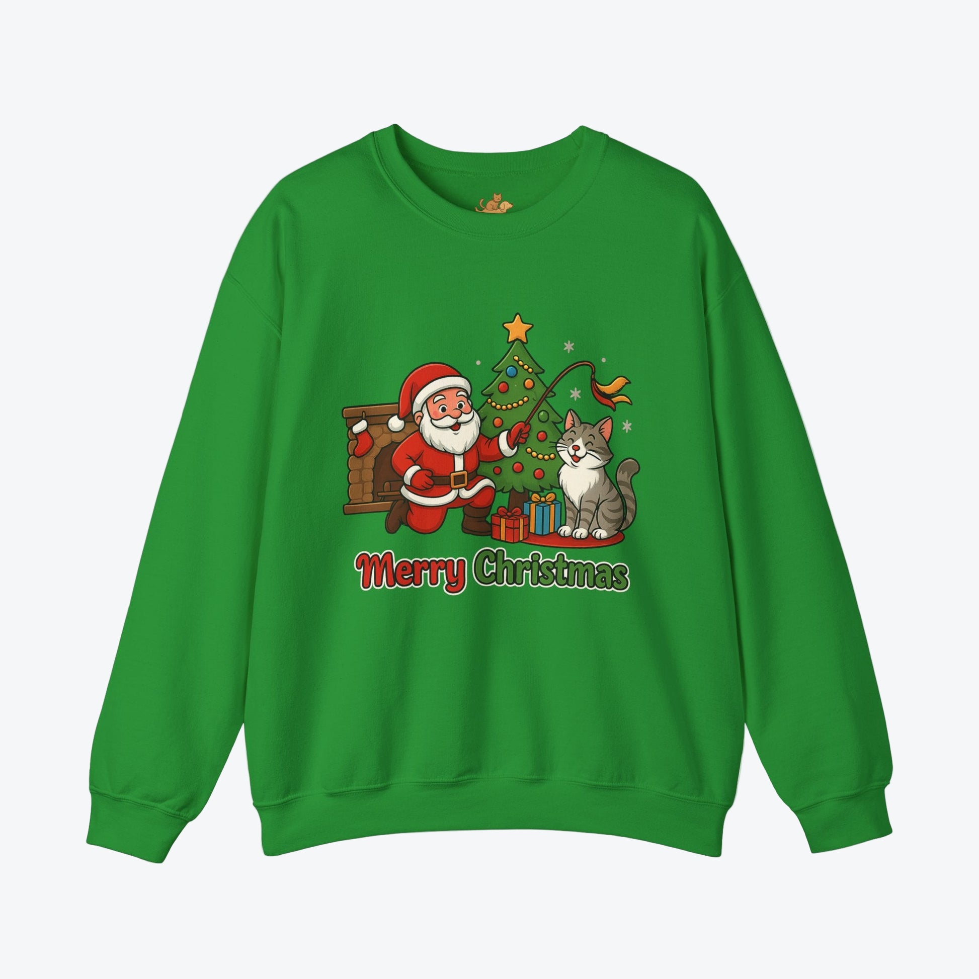 A cozy, midweight crewneck that brings soft holiday cheer to quiet evenings at home. The classic white sweatshirt features a warm, playful illustration of Santa beside a decorated tree and a curious tabby β small details that feel like a memory: stockings on the mantle, ribbon on gifts, and a little cat ready to pounce on the tinsel. Wear it when youβre wrapping presents, sipping hot cocoa by the window, or sitting on the couch watching holiday movies. The fit is relaxed but neat, with ribbed collar and cuffs that hold their shape through washes. Thoughtful construction β tubular knit for a smooth look, double-needle stitching for durability, and tear-away neck label for comfort β means this sweatshirt lives in the rotation, not the drawer. OEKO-TEX certified dyes and responsibly sourced cotton make it a mindful choice for seasonal wardrobes.
