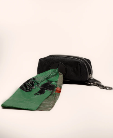 This dispenser attaches to almost any leash, has a built-in LED flashlight (to find poop at night), and fits our easy to open / easy to close drawstring dog poop bags perfectly!