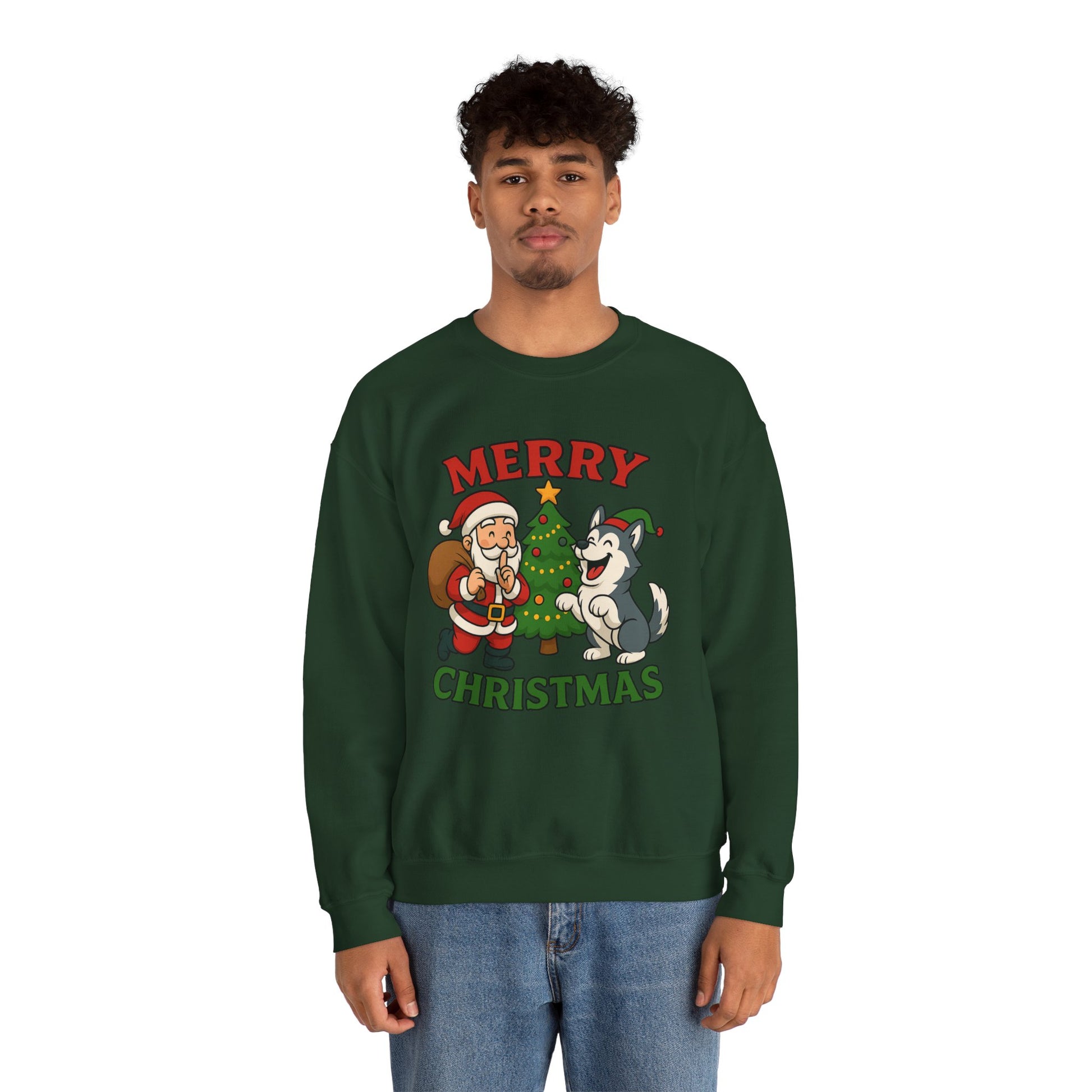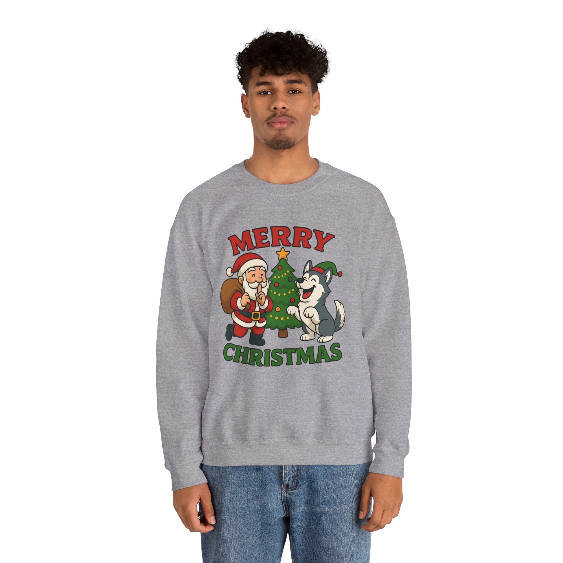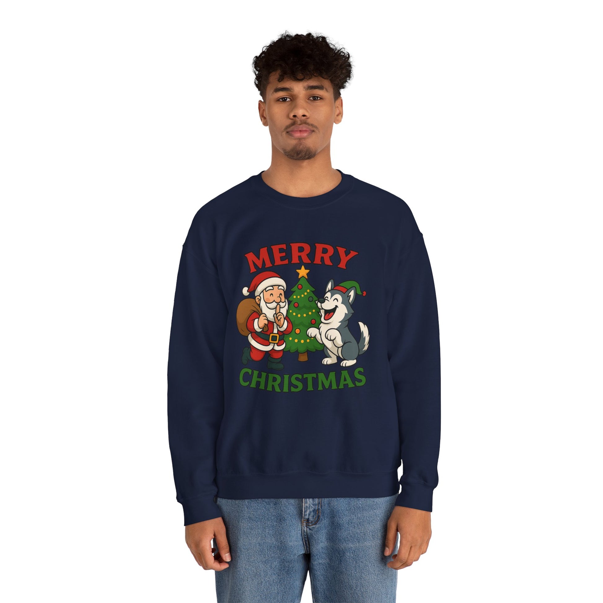 A soft, cozy crewneck that brings warm holiday cheer without shouting. The midweight cotton-poly blend feels lived-in from the first wear, with a classic fit that sits clean and relaxed across shoulders and chest. A playful vintage-style illustration of Santa, a decorated tree and a joyful husky sits centered on the front in muted reds and greens — cheerful but quietly nostalgic. Double-needle stitching at stress points and a tear-away label keep this sweatshirt durable and comfy through repeated wear and washes. It layers easily over shirts for brisk evening walks, movie nights by the tree, or casual family gatherings during the holiday stretch.
