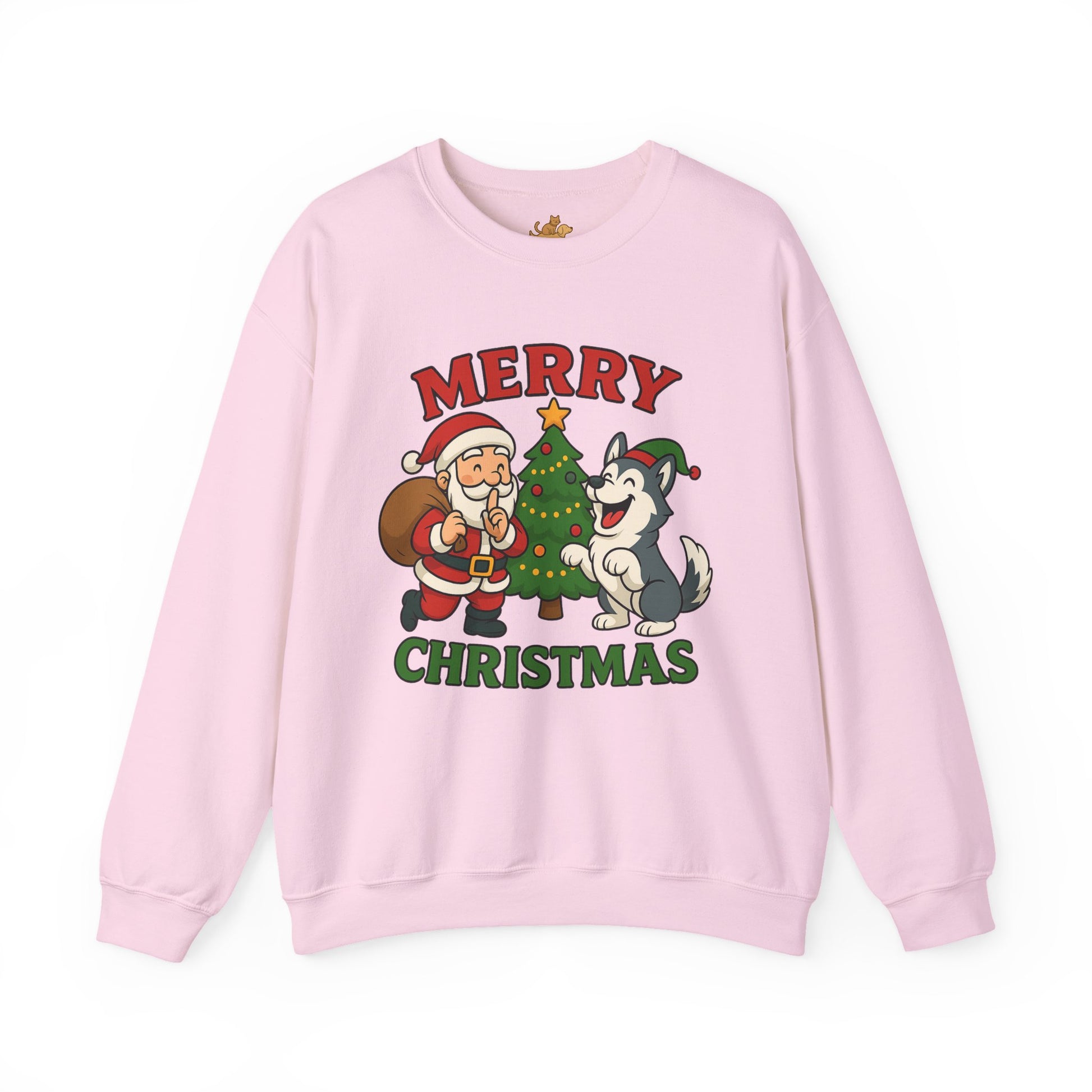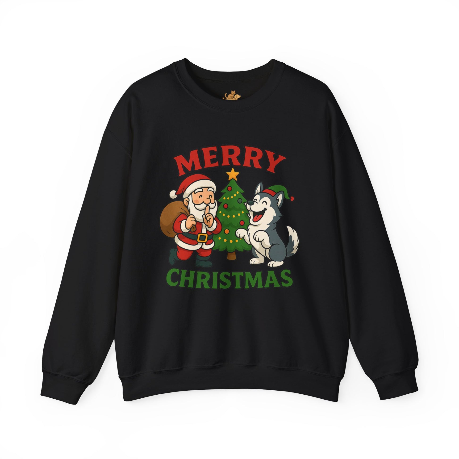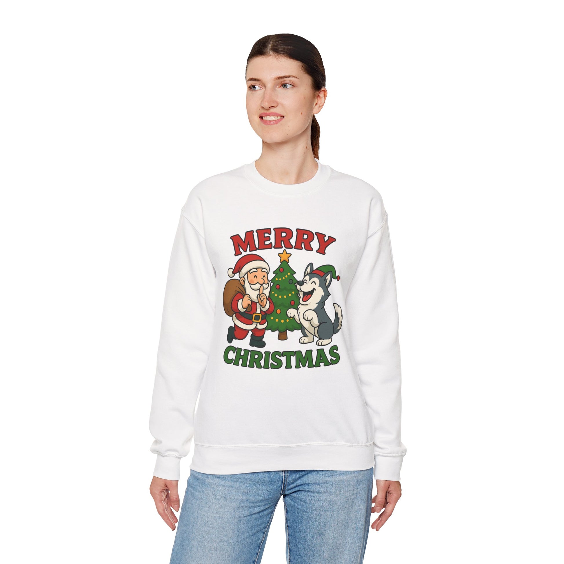 A soft, cozy crewneck that brings warm holiday cheer without shouting. The midweight cotton-poly blend feels lived-in from the first wear, with a classic fit that sits clean and relaxed across shoulders and chest. A playful vintage-style illustration of Santa, a decorated tree and a joyful husky sits centered on the front in muted reds and greens — cheerful but quietly nostalgic. Double-needle stitching at stress points and a tear-away label keep this sweatshirt durable and comfy through repeated wear and washes. It layers easily over shirts for brisk evening walks, movie nights by the tree, or casual family gatherings during the holiday stretch.